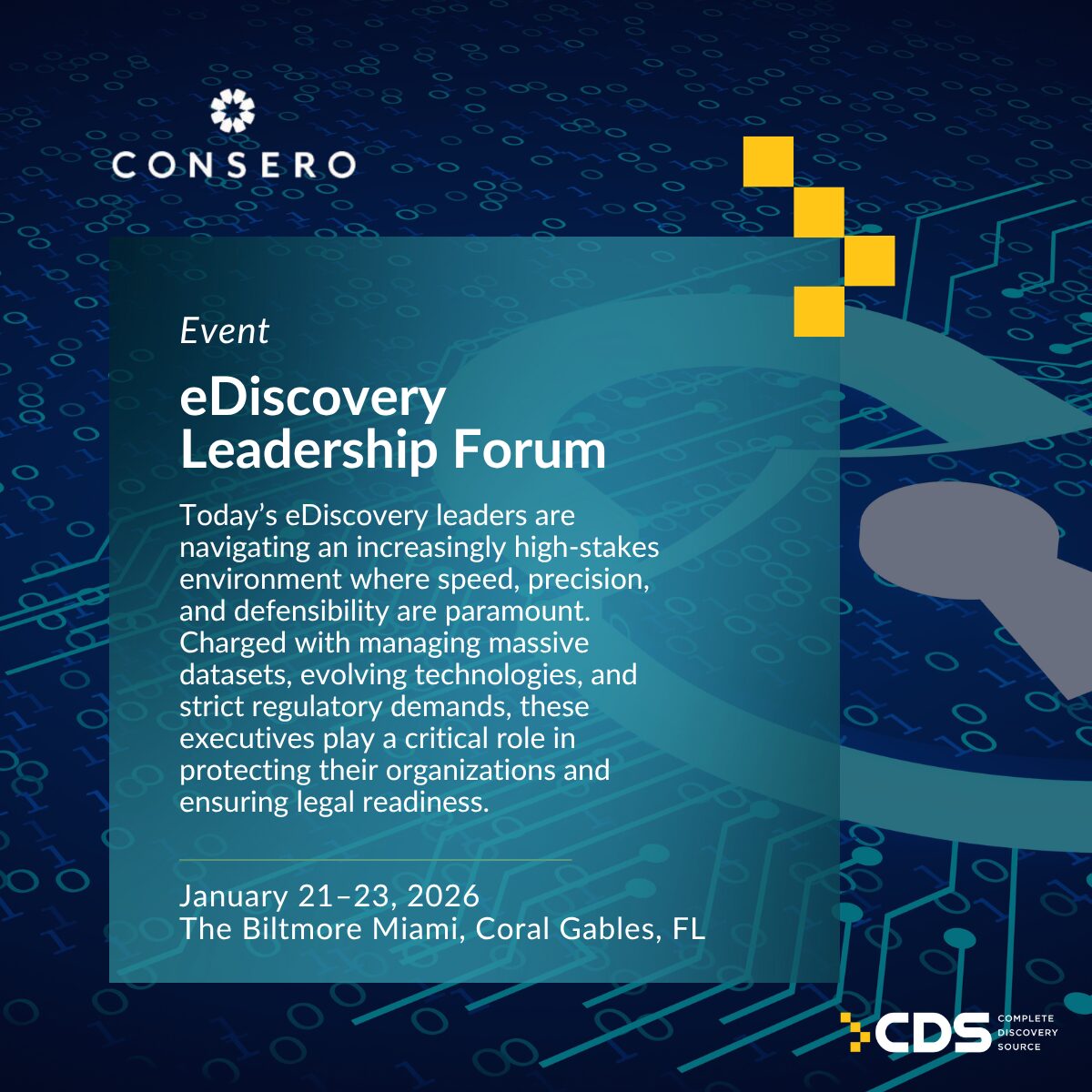 The Biltmore Miami 1200 Anastasia Avenue, Coral Gables, FL, United StatesThe Consero eDiscovery Leadership Forum is where eDiscovery leaders explore data risk, technology, and strategy through panels, breakouts, and high-level networking.