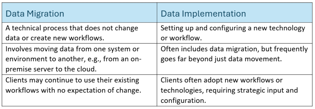Data migration and implementation often go hand in hand, and implementation frequently involves some degree of data migration. However, data migration can happen without full implementation, such as moving from one Relativity environment to another without changing the way a team operates. Here are some additional distinctions: